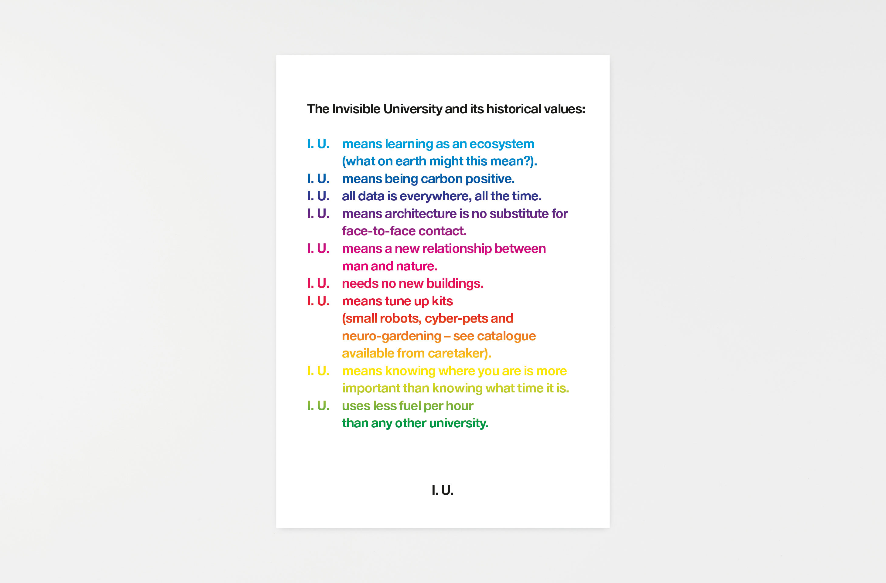 The Invisible University continues to be explored and developed by David Greene with Samantha Hardingham at the Research Centre for Experimental Practice (EXP), University of Westminster. The project is currently researching a new model for design education.
