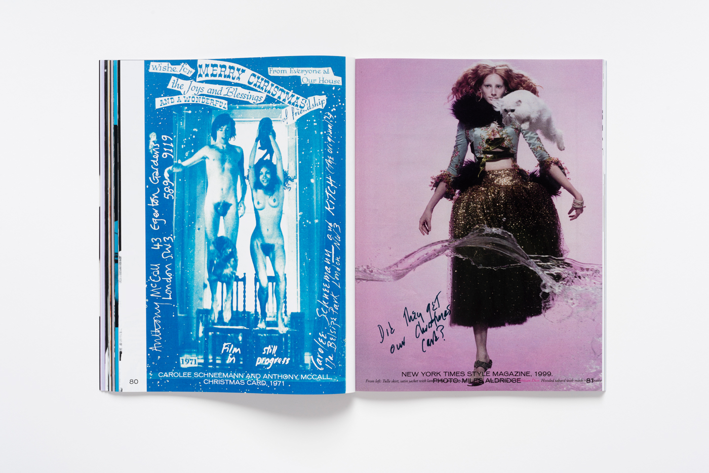 Carolee’s is the second issue of The Magazine of the Artist’s Institute. Dedicated to Carolee Schneemann, it features a previously unpublished image archive from Schneemann’s studio that documents half a century of morphological connections between her work and other visual material, including art, advertising, and popular culture. A new long-form profile of Schneemann by writer Maggie Nelson accompanies this project and considers the artist’s relationship to the history of her reception and Schneemann’s significant influence on subsequent generations of feminists.