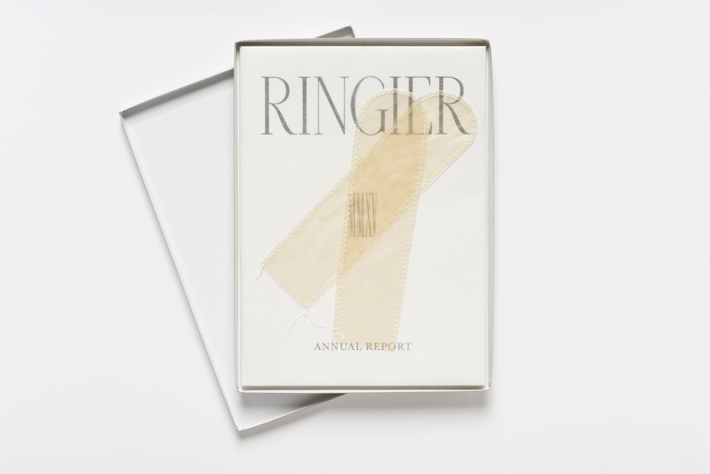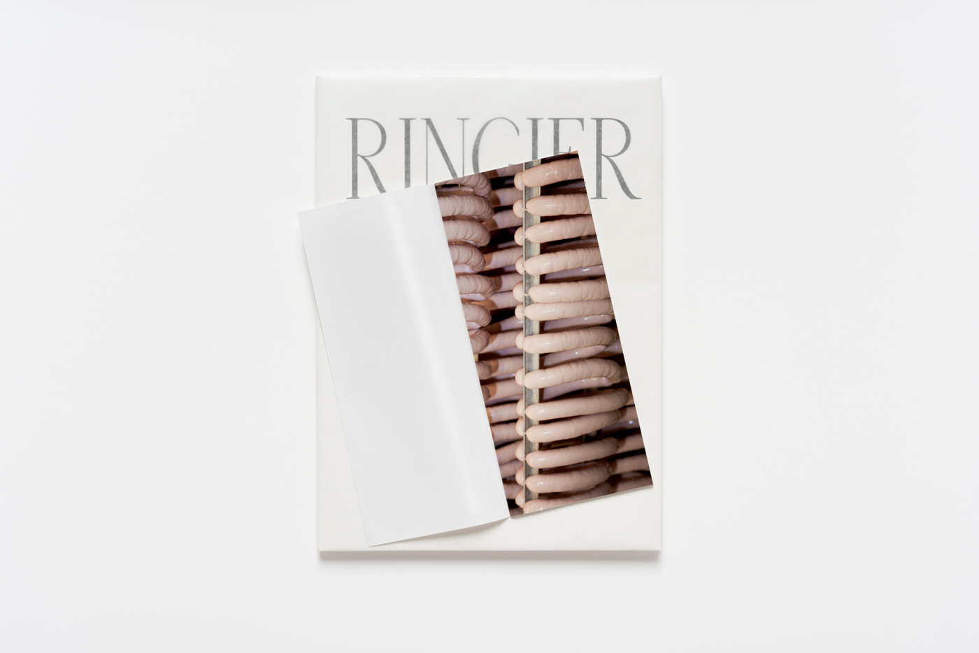 On opening the box containing the 2015 Ringier annual report, the reader is presented with two sausage casings. The materials the artist has chosen for the annual report book are thus clearly reminiscent of sausage making. There is the muslin, used to shape the sausage meat, and the greaseproof paper, used by the butcher to pack wrap the finished sausages themselves. The artist has also combined photographs taken during her visits to butchers in Switzerland with texts of her own.