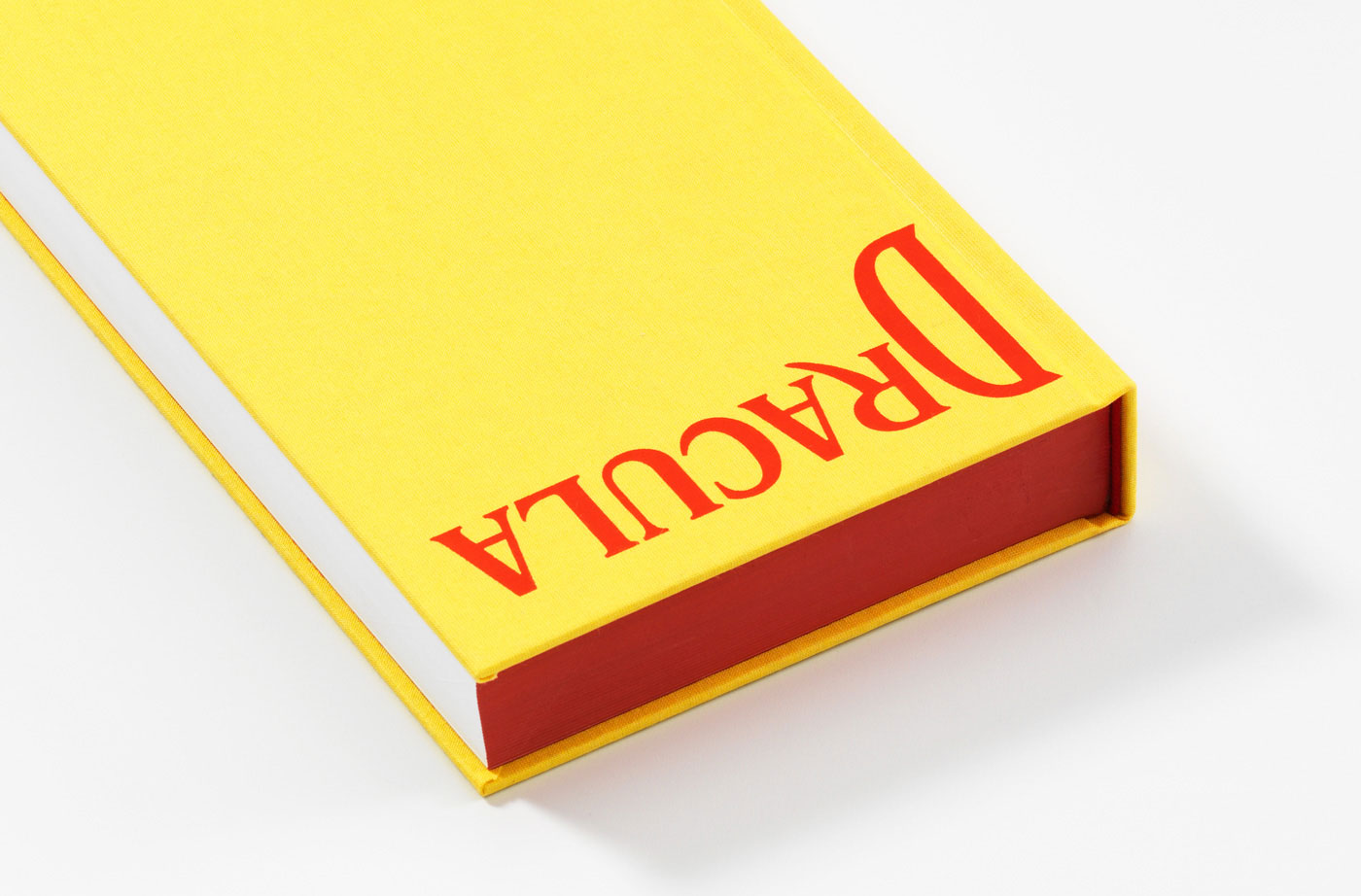 ‘John Morgan’s meticulous reading of Dracula, Bram Stoker’s classic and complex “novel” (originally published in 1897) results in a golden, golden-section edition. As one of the characters repeatedly refers to the (then) modern invention of the typewriter, Morgan has set Mina Harker’s journal entries in a quirky version of typewriter type (Remington, of course!). In fact, each character’s chapters are set in their own dedicated typeface, including Bulmer, Goudy and Akzidenz Grotesque (a font first released in 1896). Even a two-line telegram is set in Orator Standard, exactly matching a telegram of the time. The book’s binding is reminiscent of The Yellow Book – another near-contemporary. Except that, instead of black, the blocking of the stylish title-piece is blood red – as are the endpapers, the head-and-tail-bands, and the tops of the pages. The reproduction of the delicate illustrations (by James Pyman), the choice of paper and the golden-section format add up to an elegant and most satisfying example of modern book design and production (production supervised by Martin Lee).’ (Derek Birdsall, Eye magazine blog, 2009)