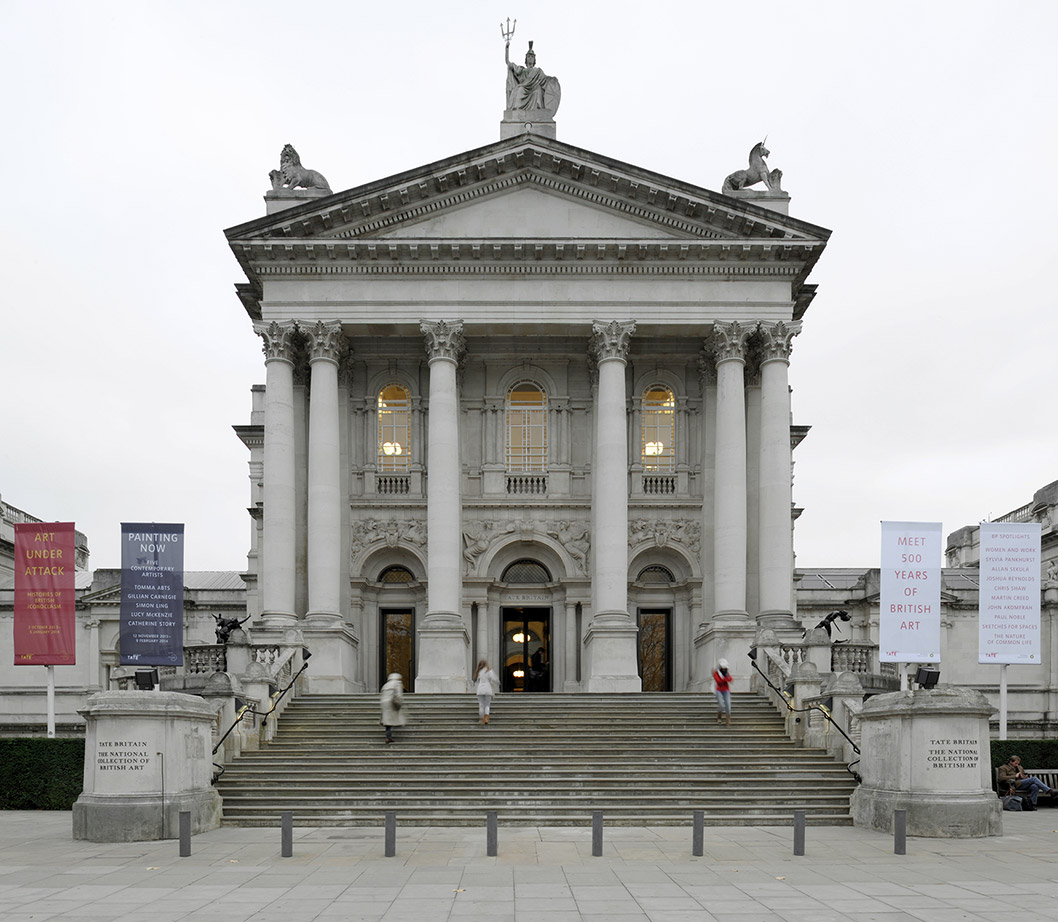 As part of the re-hang, and the ‘Walk through British Art’ display, the gallery layout has been reconfigured to create a circuit around its outer perimeter, exploiting the long enfilades of galleries that open onto each another. The circuit travels anti-clockwise around the building, with threshold dates sign-painted onto the floor to tell you where you are in time. This is supported by a schematic map of the chronological circuit cut in brass. Permanent aluminium captions and labels are painted to match the wall colours, angled and positioned below the artworks. The emphasis is on looking rather than reading first (more contextual information is given in the new Tate Britain Companion). Where possible and appropriate, we replaced unsympathetic vinyl donor accreditation with sign-painted gilt letterforms painted directly onto walls by Phil Surey. We designed a new display typeface inspired by Bowles – a ‘British vernacular’ letterform for a British building. This letterform is cast in brass for external signs and silkscreened directly onto the interior walls. Where the ‘Tate Pro’ typeface is used, we commissioned an expert set of numerals – a better fit for the number-heavy data we were presenting. As part of a ‘total’ scheme for Tate Britain, we designed templates for new maps, menus, banners and posters.