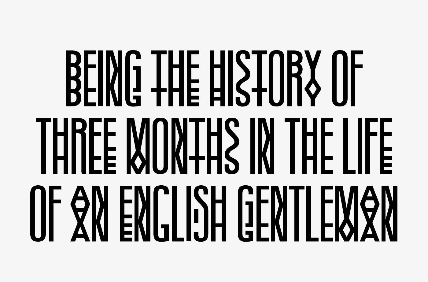 Rudy was designed for an edition of The Prisoner of Zenda, the seventh book in the Four Corners Familiars series. Rudy is based on and inspired by Raymond Hains’ typographic experiments. The distortion of each letterform is rationalised to a mostly twice vertical repeat, which fits with the book’s overriding theme of doubles and gives the page the texture of blackletter. It is named after one of the book’s characters, King Rudolf Rassendyll of Ruritania (and one of John Morgan’s sons).
