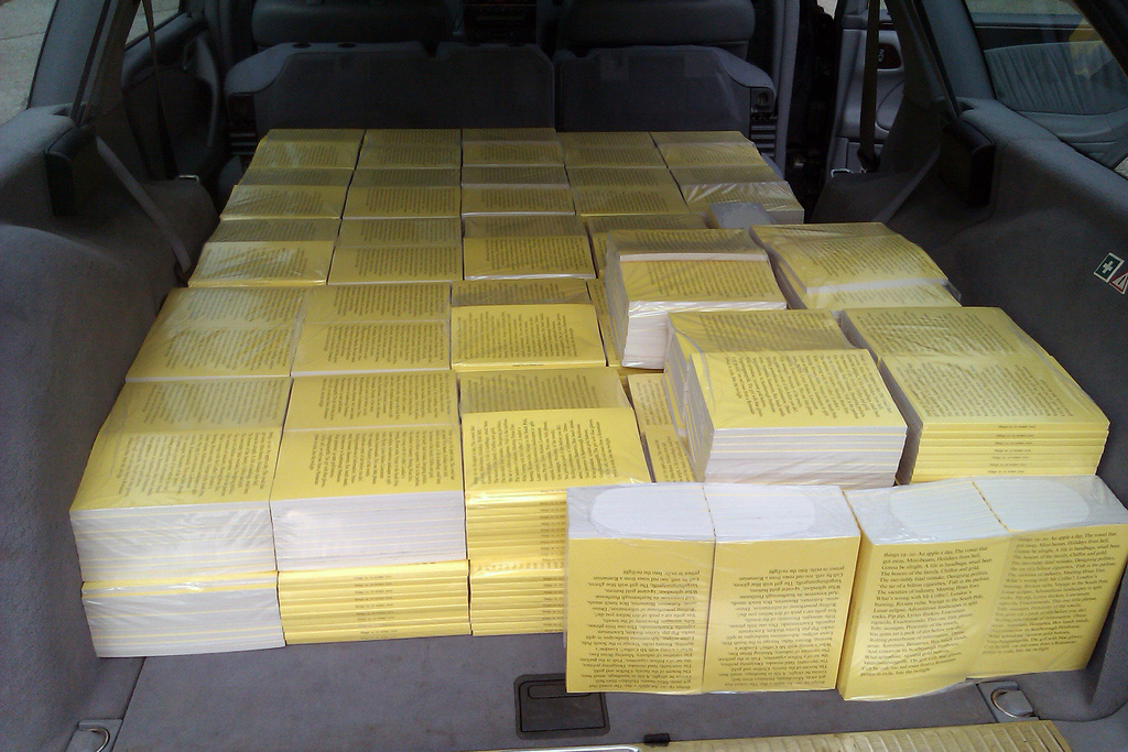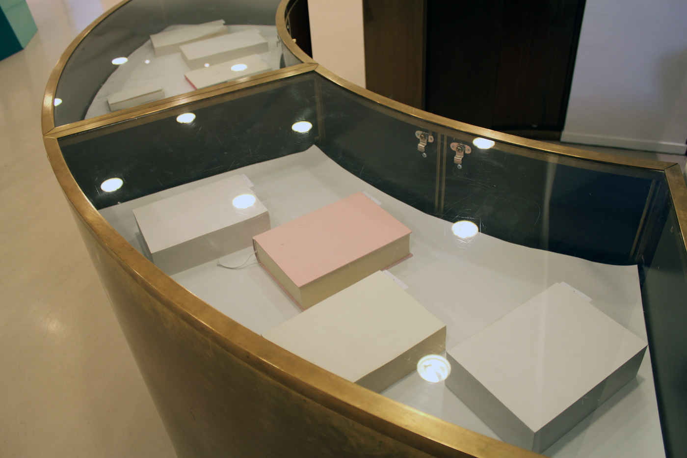 A wall of blank dummies made for studio projects: 'The graphic designer and typographer John Morgan will display a selection of publications, highlighting the material side of bookdesign, an aspect of books rarely discussed. John Morgan will also give a talk about his work with the Four Corners Familiars series that features artists’ responses to classic novels and short stories. Each book is different in style and format, according to the needs of the artwork and the text. Six titles have now been completed, with more being prepared.'