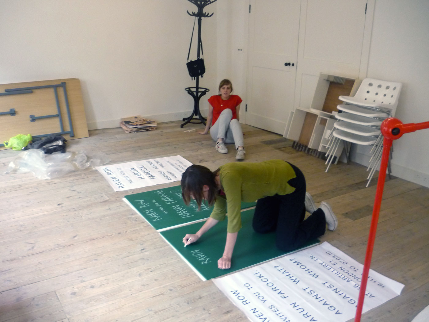 Making the Farocki sign. A green chalkboard. Alice and Sue from Raven Row. Go to project page.