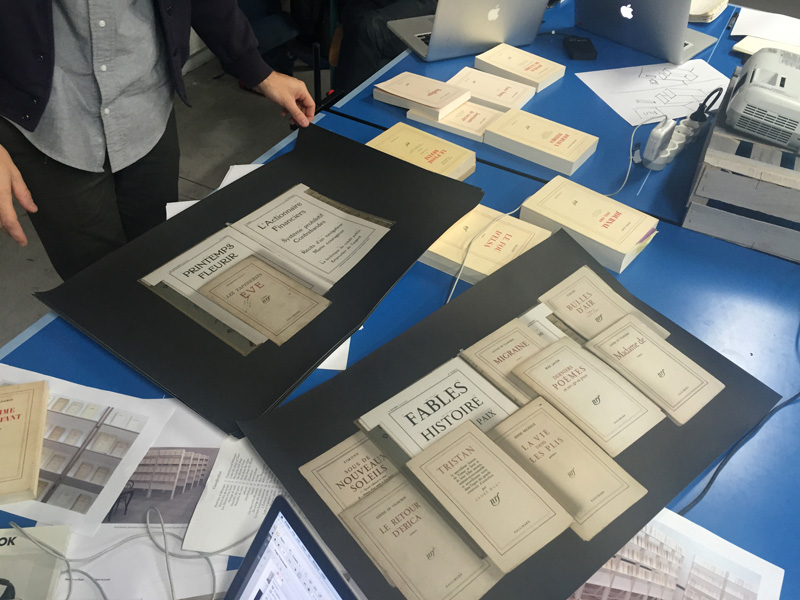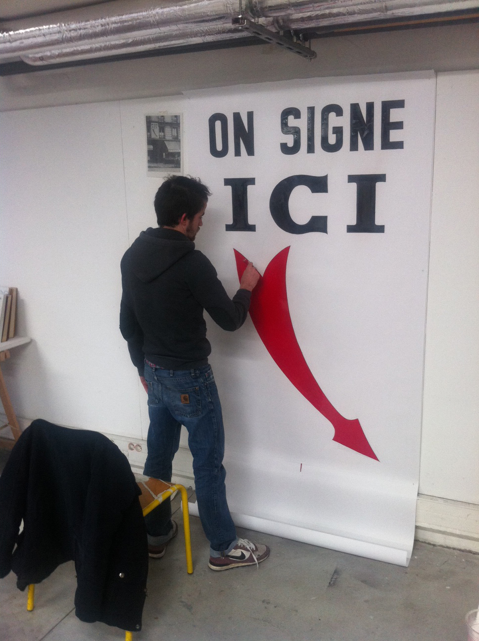 John sets a workshop at the École des beaux-arts de Lyon inspired by Breton's Nadja. Photograph of workshop participant Alaric Garnier recreating a sign from the book.