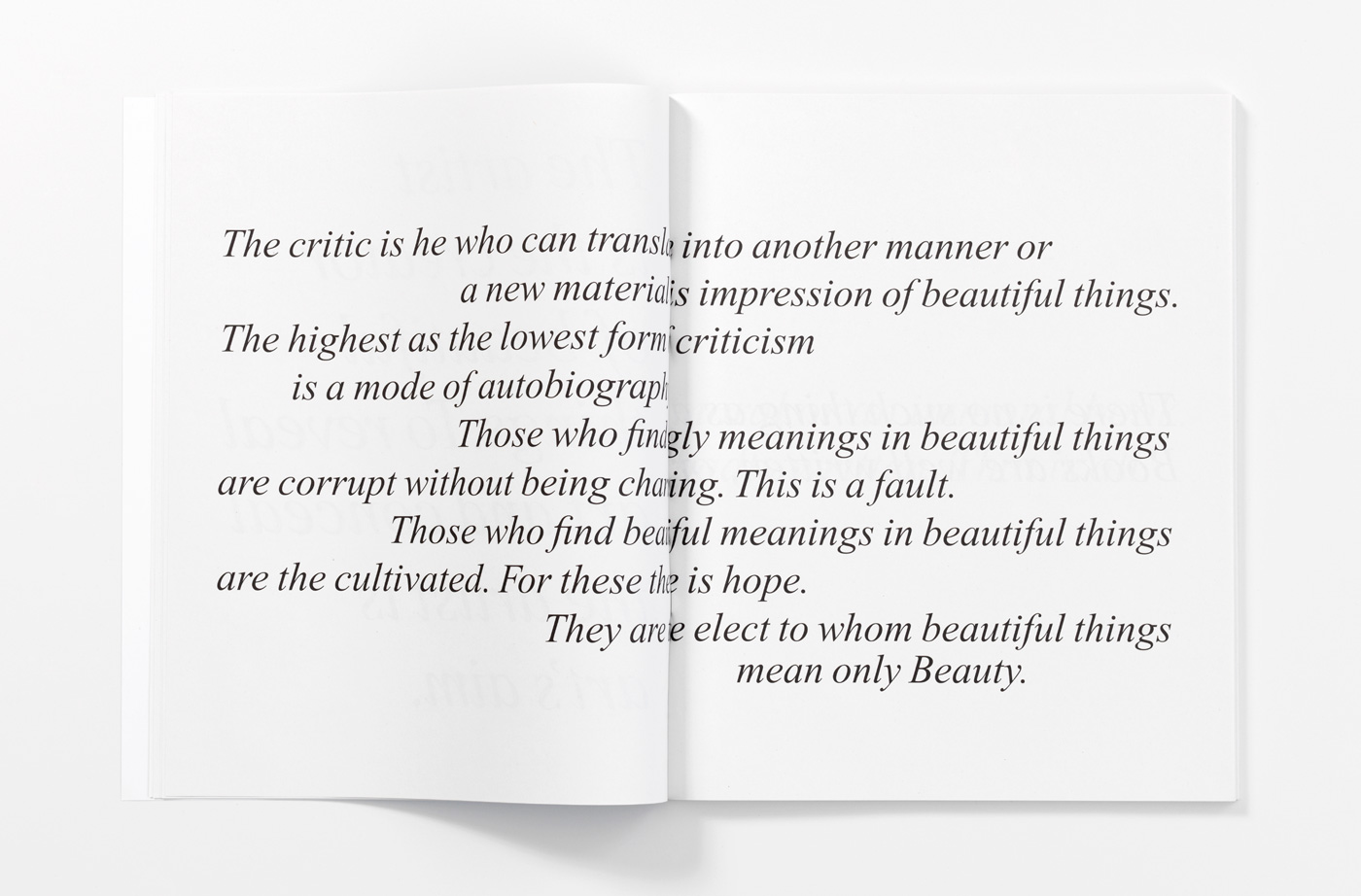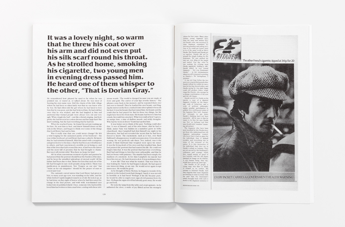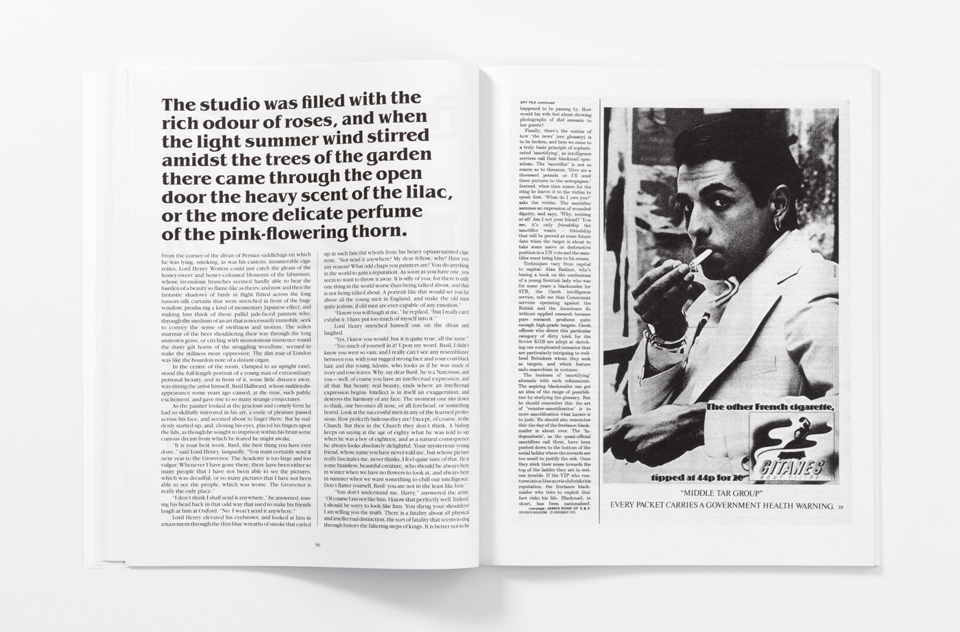 ‘The “Familiars” series, which commenced last autumn with an acclaimed new edition of Oscar Wilde’s The Picture of Dorian Gray (1890), designed by John Morgan to a concept and art work by Gareth Jones, is a bravura example of how an iconic book might be re-enacted. Returning, on the one hand, to the publishing history of Wilde’s novel, which first appeared in print on 20 June 1890, as pages 3–100 of Lippincott’s Monthly Magazine, the “Familiars” edition restored the book to its physical form as a large-format, magazine-style publication. The pages turn over with languid ease, as though to the neat flick of a doubtlessly yellow-gloved hand. The phrase “A young man of extraordinary personal beauty” is printed on the pale blue cover in dense black letters. Wilde’s famous preface to his novel, in the form of a succession of aphorisms (concluding “All art is quite useless”), is printed in large italics, with entire pages and double-page spreads luxuriously given over to the rolling flow of each maxim and paradox. The effect is to refresh and dramatize one’s reading of the text, while also reminding the reader of the complexities of Wilde’s cultural enshrinement. And yet this is only one half of the artistic formula at work in The Picture of Dorian Gray as reconceived by Jones. By way of design, motif, typography and, most importantly, the inclusion within the text (as illustration) of advertisements for Gitanes cigarettes – originally made in the 1970s by the Hipgnosis advertising agency for UK print media and featuring suave, Gallically handsome male models – Jones re-routes the novel to both concepts of masculine beauty and the reclamation of Art Nouveau and Wildean foppishness within the subcultural pop styling and fashions of the early 1970s.’ (Michael Bracewell, Editions of You, Frieze 116, 2008)