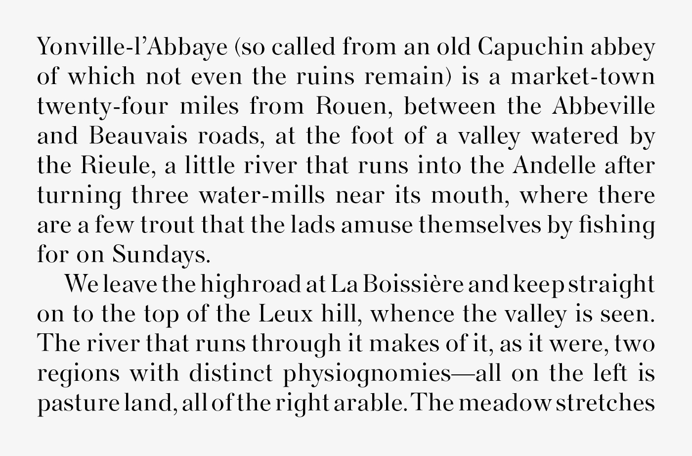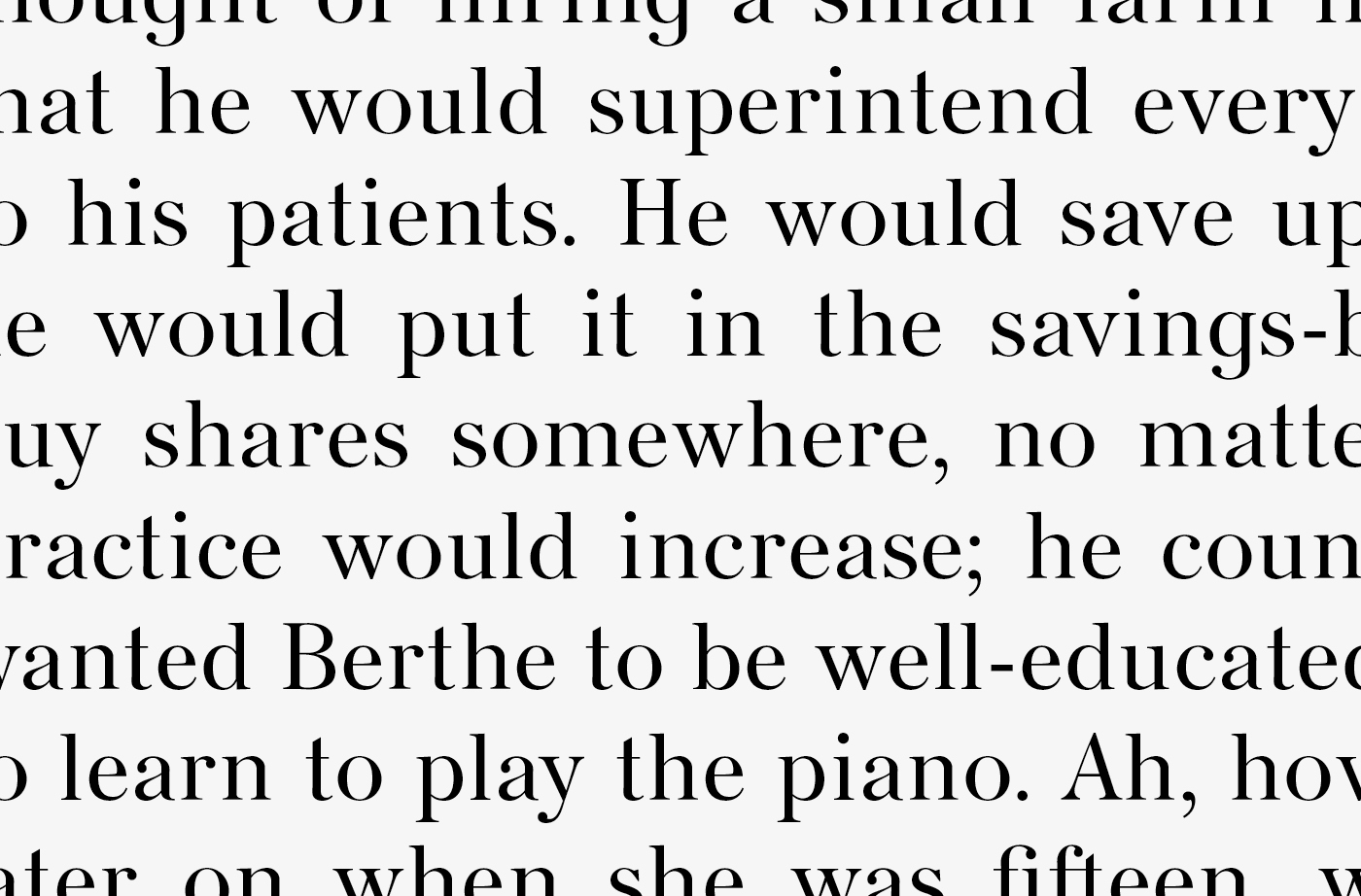 We developed a new typeface, Berthe, named after Emma Bovary’s neglected child for an edition of Flaubert’s Madame Bovary. We commissioned and worked with Charles Mazé, who drew this bespoke version based on a Deberny specimen of Série 16 from 1894.