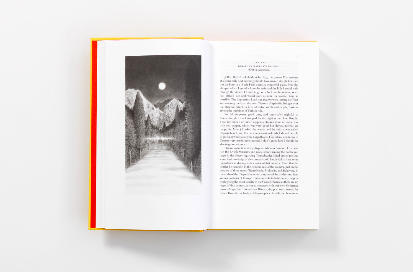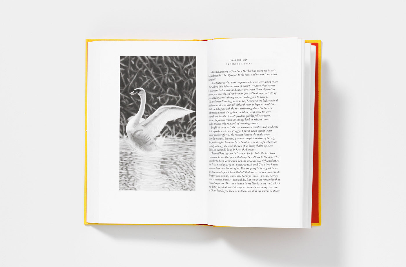 ‘John Morgan’s meticulous reading of Dracula, Bram Stoker’s classic and complex “novel” (originally published in 1897) results in a golden, golden-section edition. As one of the characters repeatedly refers to the (then) modern invention of the typewriter, Morgan has set Mina Harker’s journal entries in a quirky version of typewriter type (Remington, of course!). In fact, each character’s chapters are set in their own dedicated typeface, including Bulmer, Goudy and Akzidenz Grotesque (a font first released in 1896). Even a two-line telegram is set in Orator Standard, exactly matching a telegram of the time. The book’s binding is reminiscent of The Yellow Book – another near-contemporary. Except that, instead of black, the blocking of the stylish title-piece is blood red – as are the endpapers, the head-and-tail-bands, and the tops of the pages. The reproduction of the delicate illustrations (by James Pyman), the choice of paper and the golden-section format add up to an elegant and most satisfying example of modern book design and production (production supervised by Martin Lee).’ (Derek Birdsall, Eye magazine blog, 2009)