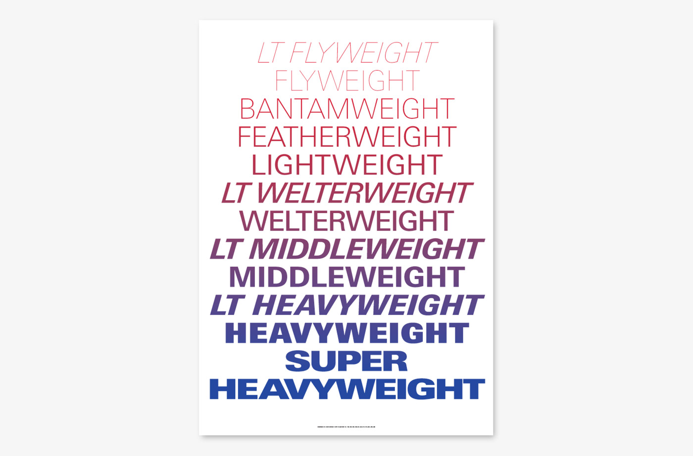 There have been between seven and twelve Olympic boxing weights over the years. This poster equates twelve boxing weights to twelve variants of the reworked extensive Univers type family. Adrian Frutiger originated a unique numbering system rather than names to designate weights and variants. Here the boxing weight categories offer an alternative classification system. Its opposing sides/corners of red and blue meet in a gradient that joins the brutal history of letterpress end silkscreen “text-only” boxing posters.