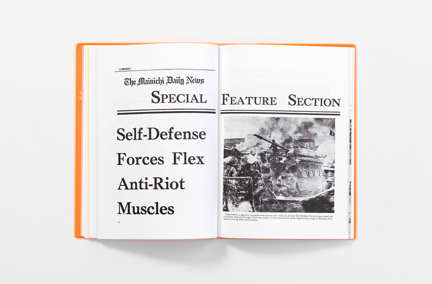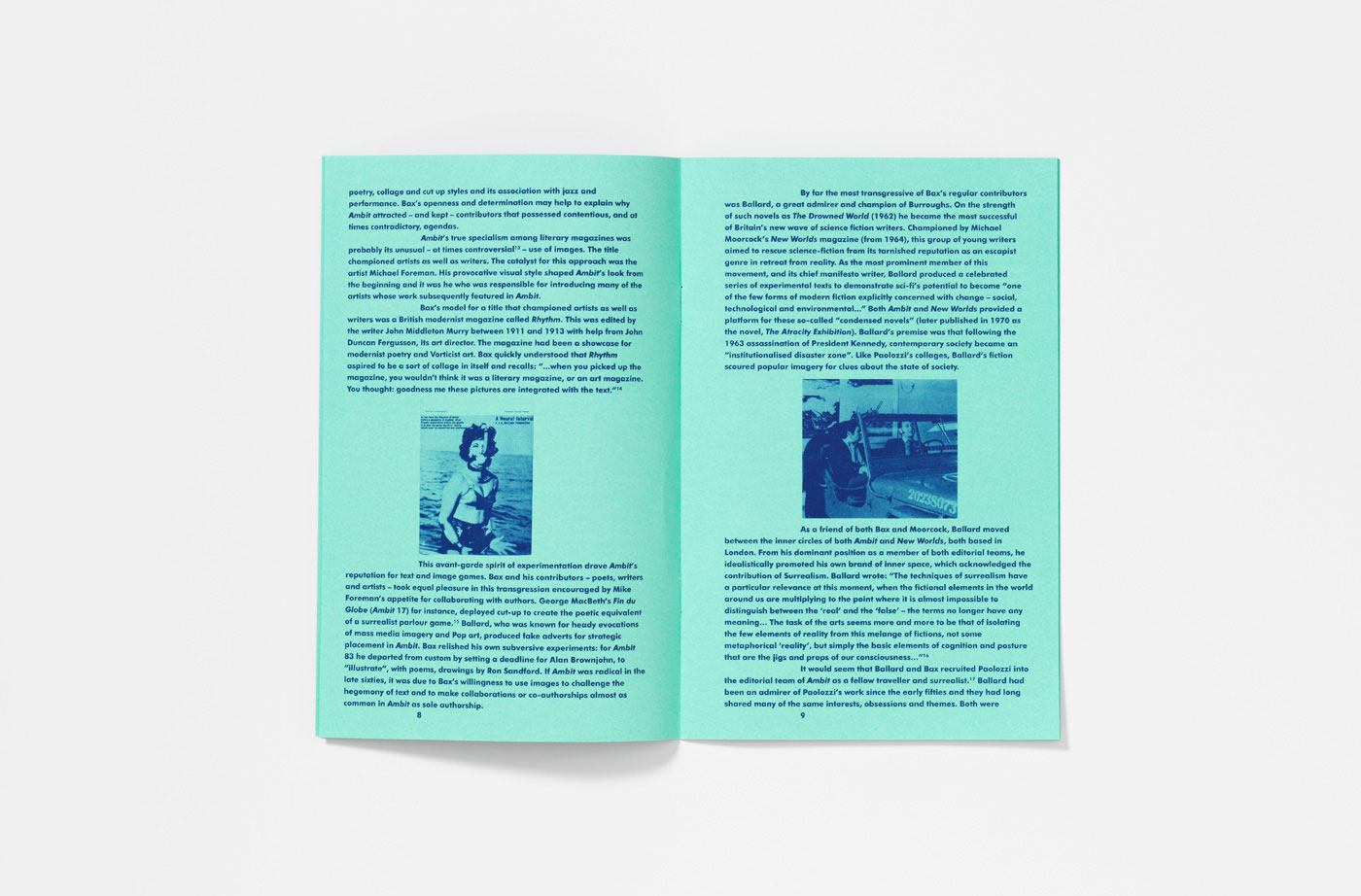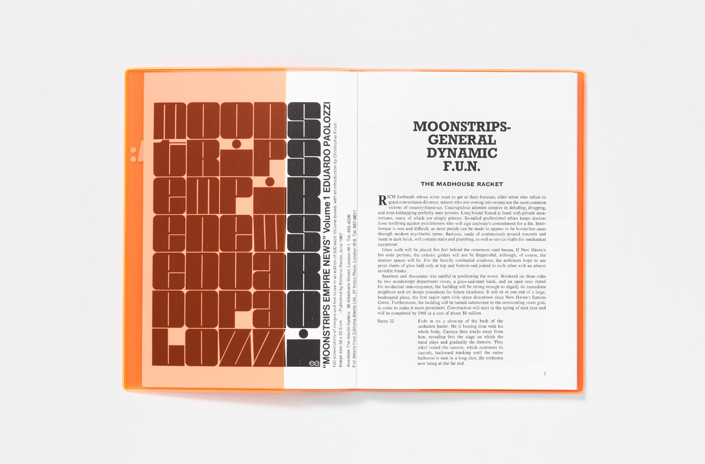 ‘Although their Paolozzi book will reproduce existing work, it will make a fresh interpretation of it by taking a leaf out of Paolozzi’s own working methods. Morgan’s approach to the design of the book could be described as structural rather than visual. Original Paolozzi spreads are re-created full-size (the book has the same dimensions as an issue of Ambit magazine) as sections from the original magazines. Thus stray pages of editorial and advertising that were published adjacent to Paolozzi’s spreads also appear in the book. Individual Ambit covers relating to the issue in which each episode originally appeared are used as dividers. The reader finds snatches of poetry, a contents page or a printer’s advertisement bumping up against Paolozzi’s work in much the same way as collaged elements collide within his work. Four Corners’ book project aims to let Paolozzi’s works stand as they are with relatively little intervention, thus even the added written content (an essay contextualising the work by David Brittain) remains a separate booklet. It is held together with the main content of the book by a neon pink plastic dust jacket. inspired by Paolozzi’s Moonstrips Empire News, a 1967 portfolio of screenprints housed in a pink acrylic box.’ (Angharad Lewis, ‘Opening Ambit’, Grafik 170, 2009)
