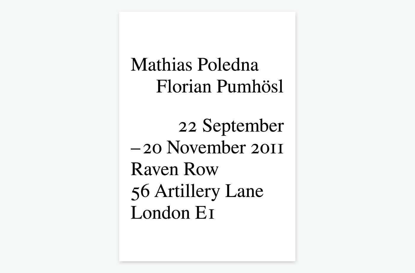 ‘For this exhibition Mathias Poledna (b. Austria, 1965) and Florian Pumhösl (b. Austria, 1971) have each created a single expansive new work. Poledna has produced a 35 mm film for Raven Row’s ground floor, and Pumhösl has made a series of 54 glass paintings for its panelled upper galleries. The interaction between these works and their spatial implementation plays a key role in the exhibition, addressing Raven Row’s distinct architecture, and the potential for dialogue across different conceptual frameworks.’ (Raven Row)
