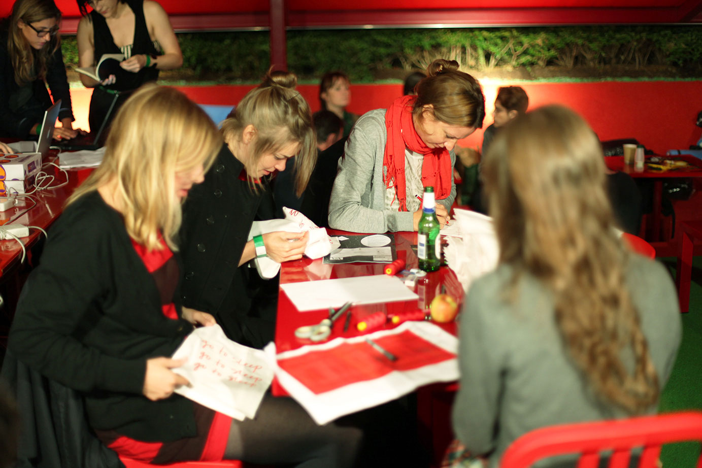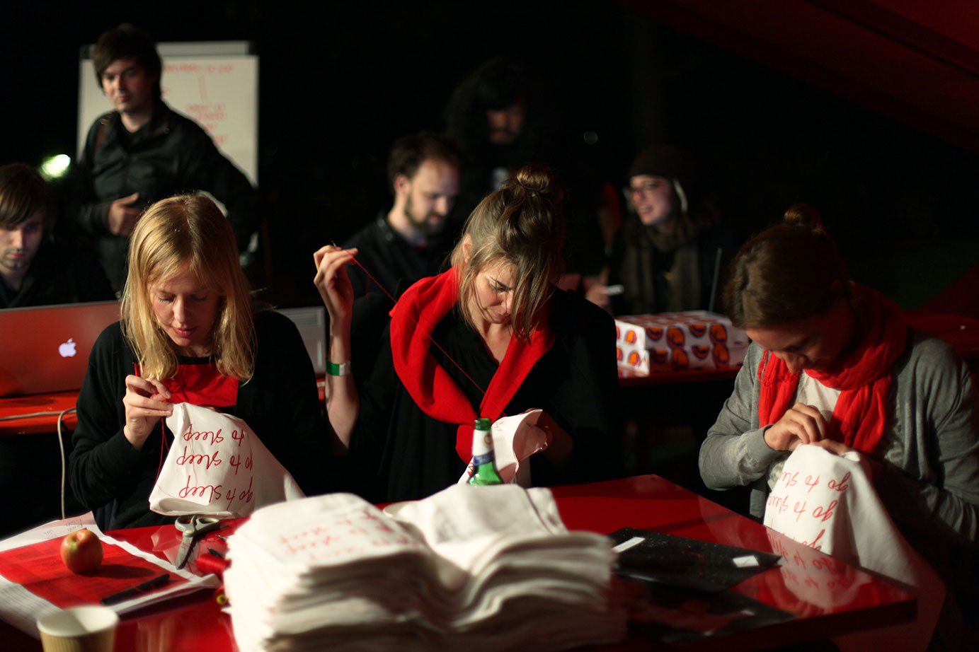 The evening will be documented in a hand made book, collated and designed throughout the night by John Morgan studio. The book will be hand crafted and will be delivered to participants in the morning. Content for the newspaper will be gathered in workshops run by the Sleepover’s participants and performers throughout the night.’ (Serpentine Gallery)