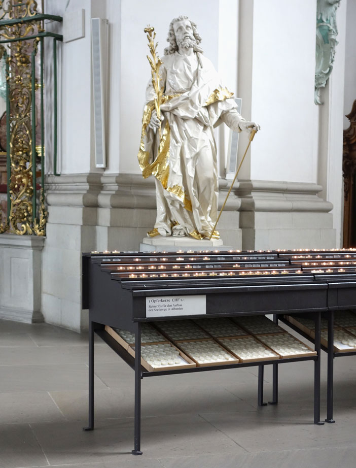 Design of Alpha and Omega symbols engraved on the chancel cross.