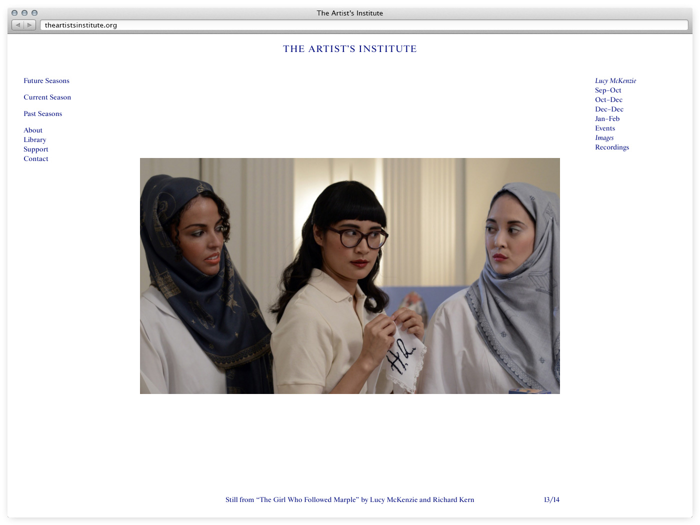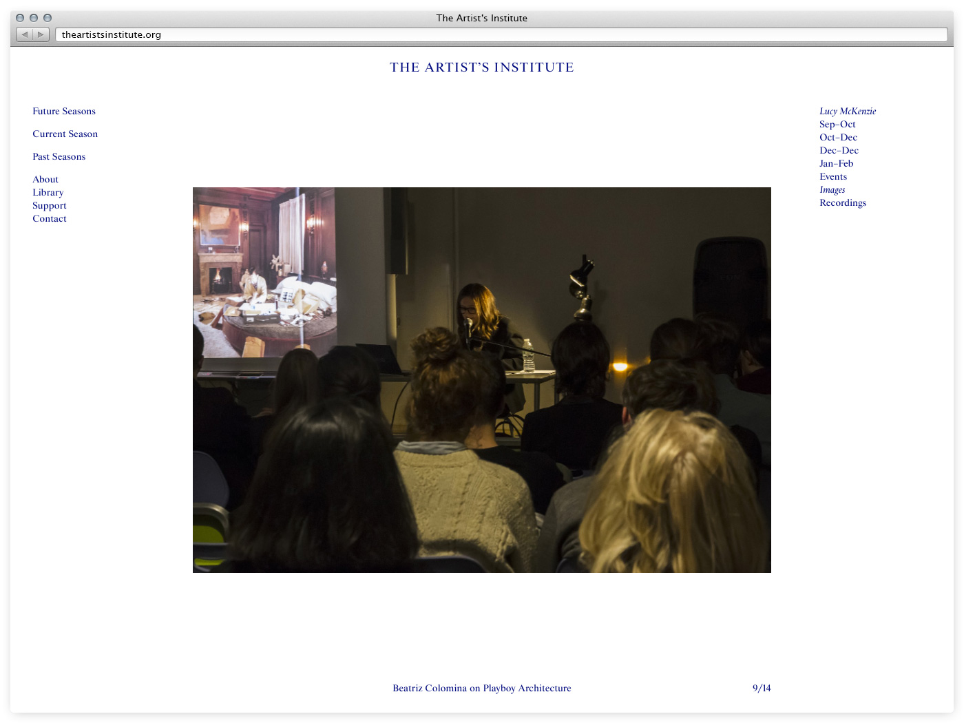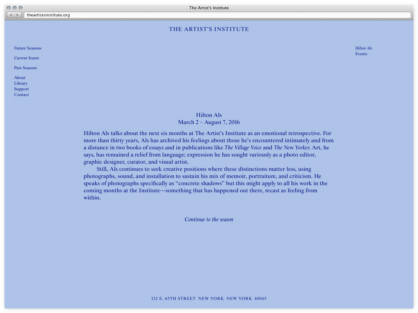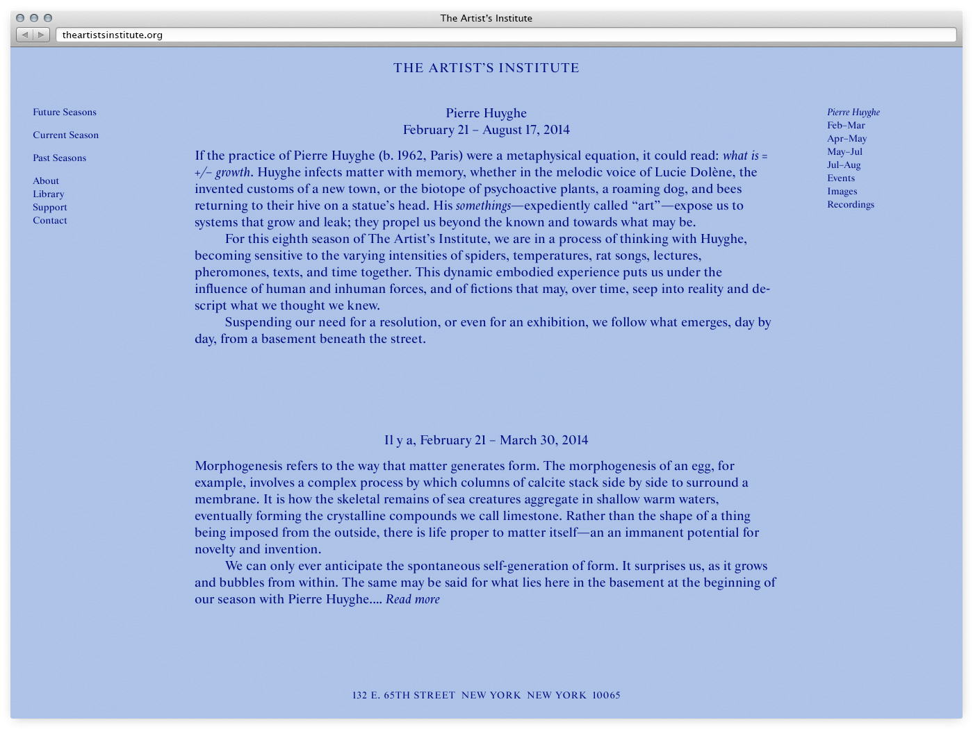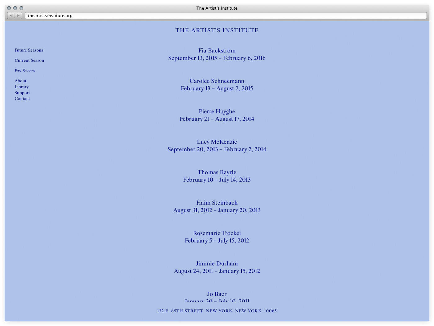 The Artist’s Institute is a non-profit research and exhibition space for contemporary art that dedicates six-month seasons to a single artist whose work prompts a series of public programs with related artists and thinkers.