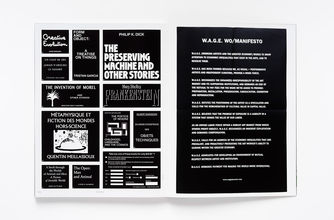 Pierre’s covers the recent work and research interests of Pierre Huyghe – featuring topics as varied as genetic engineering, new realist philosophy and the science fiction of Philip K. Dick – to draw a complex portrait of the artist’s practice. Contributors include A. E. Benenson, Stephen Blackwell, Ali H. Brivanlou, Etienne Chambaud, Ian Cheng, Angelique Corthals, Melissa Dubbin & Aaron S. Davidson, Tristan Garcia, Camille Henrot, David Horvitz, Pierre Huyghe, Jenny Jaskey, Jonathan Lethem, Alex Mar, Vladimir Nabokov, Vincent Normand, Fernando Ortega, Jean Painlevé, Sean Raspet, Martin Roth, Dorion Sagan, Dash Shaw, Fabrien Giraud and Raphaël Siboni, and Karl Sims.