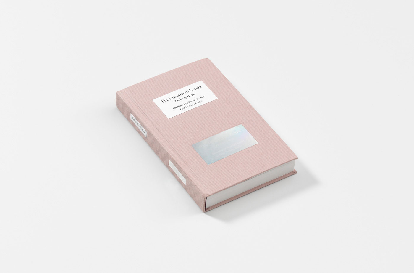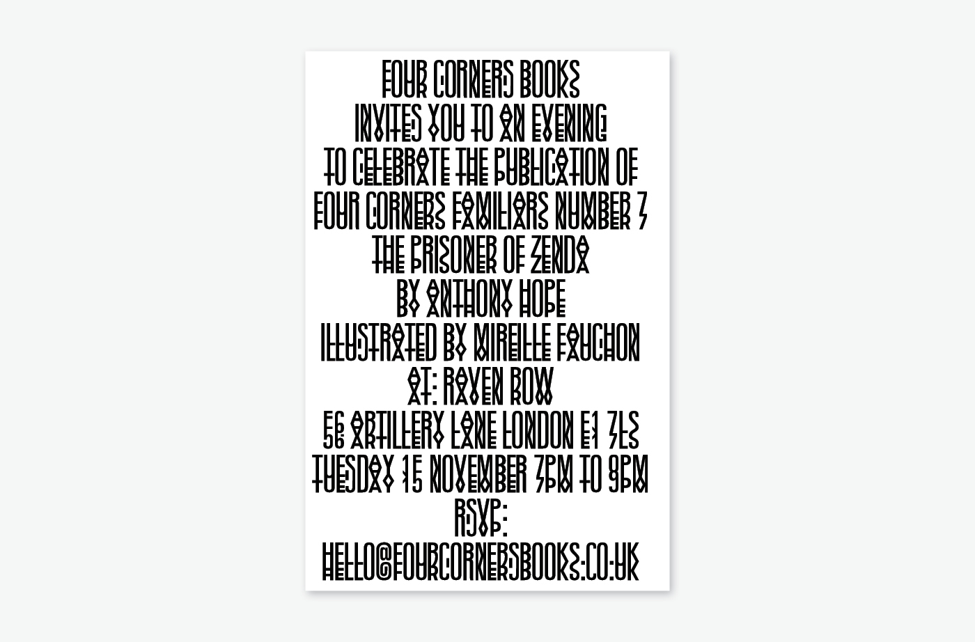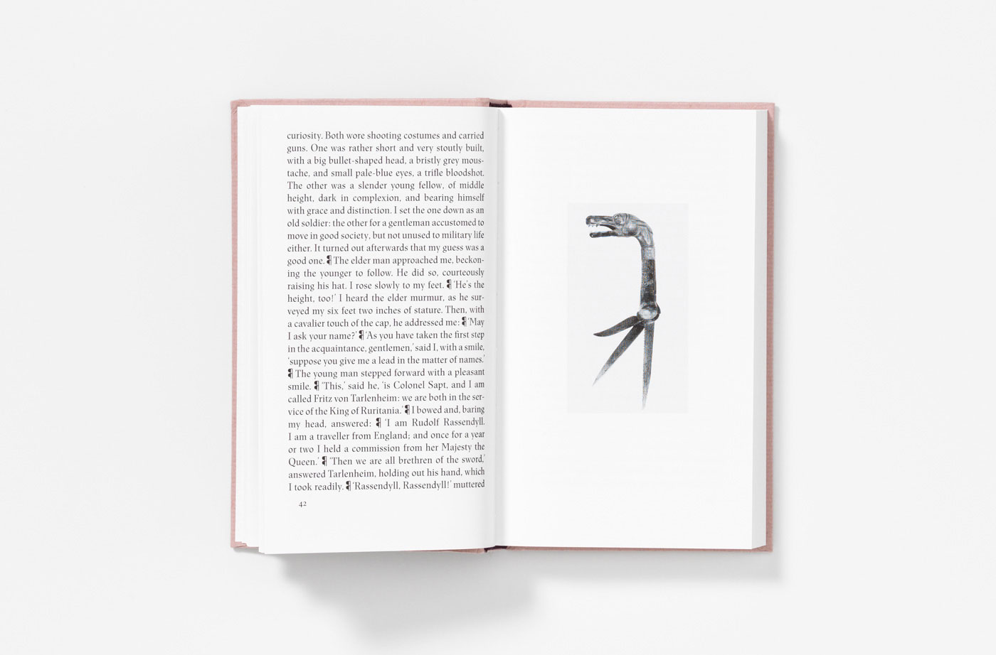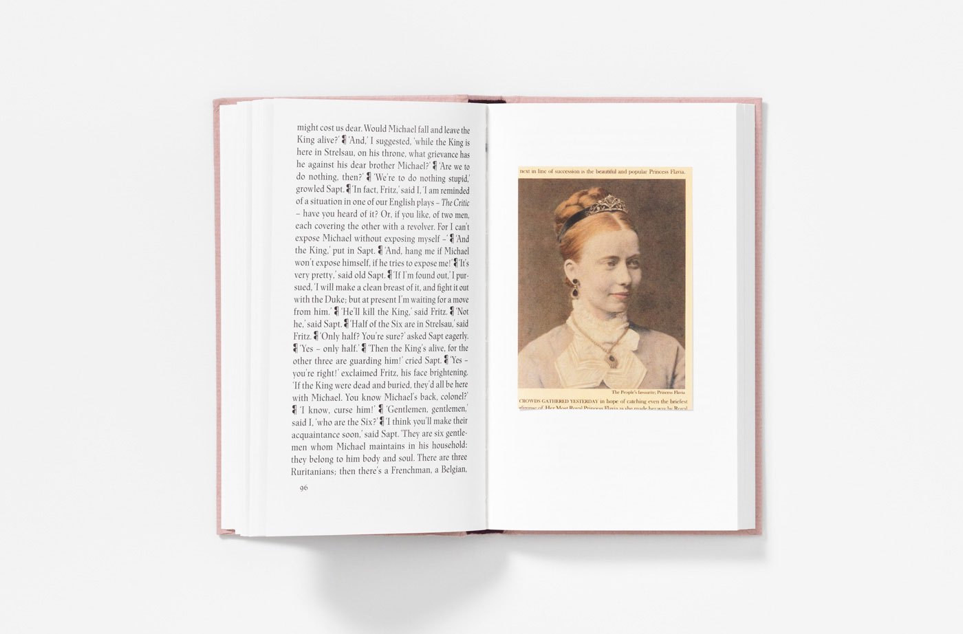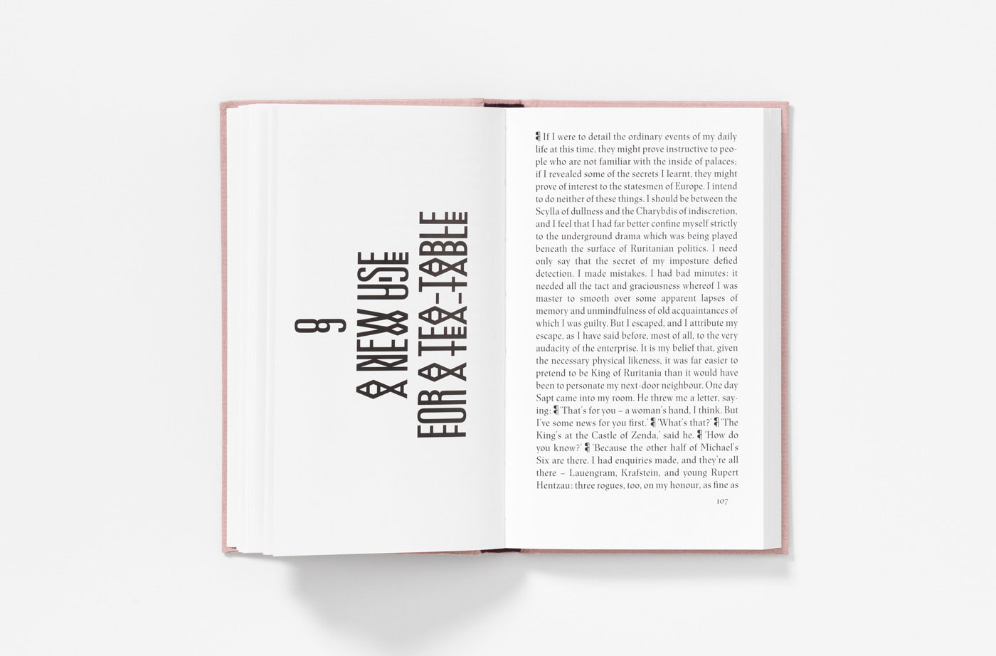 The display text is set in Rudy, a typeface designed for this edition. Rudy is based on and inspired by Raymond Hains’ typographic experiments. The distortion of each letterform is rationalised to a mostly twice vertical repeat, which fits with the book's overriding theme of doubles and gives the page the texture of blackletter. It is named after one of the book’s characters, King Rudolf Rassendyll of Ruritania (and one of John Morgan’s sons).