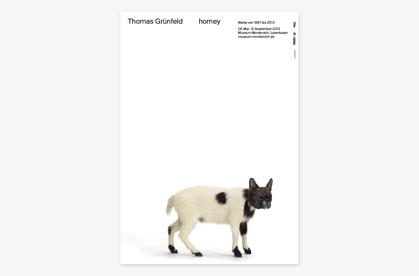 ‘Museum Morsbroich presents Thomas Grünfeld – homey. Works dating from 1981 to 2013. Spongy ochre-coloured puddles ooze around the floor, a whiff of 1950s fustiness has become entangled in the spiky plant, colourful felt collages decorate the walls, and the room is populated by strange animal creatures: Welcome to the untameable realm of collective memories. This is the first museum retrospective exhibition of works by Thomas Grünfeld, who was born in Leverkusen and teaches at the Kunstakademie Düsseldorf. Grünfeld’s extraordinarily diverse oeuvre, presented here for the first time in a survey exhibition, is characterised by strictly separate work groups.’ (Museum Morsbroich)