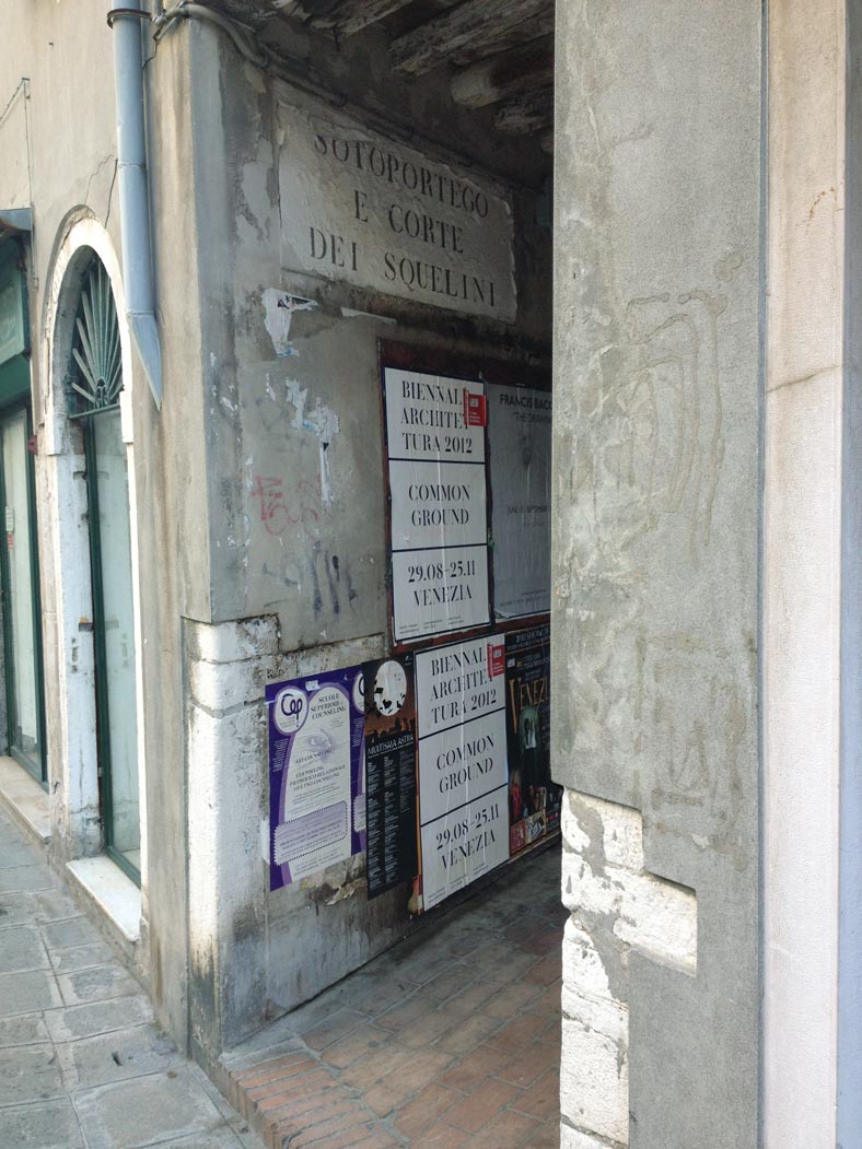 ‘The Venetian stencil street signs or Nizioletti don’t prevent you from getting lost in the labyrinth, but they do comfort you or allow you to get lost in the most elegant way. They speak to you not in an Italian but a Venetian dialect – “Calle” rather than “Via”. Given their frequency, that they don’t irritate or disturb is a measure of their visual properties – they must be the most beautiful of city sign systems (the v-incised Bath street names defined by light and shade alone follow closely behind). The stencil text is contained in a white plaster panel – Nizioletti means “white sheet or cover” – roughly framed in black. The text is also painted black, but this black like so much in Venice has undertones of blue, a prussian blue (the blue used in blueprints) or a deep black water. To the passer-by the white rectangle often appears to be positioned in alignment with the interior ceiling ribbed with beams. The sheets which stack like sails when there’s lots to say, expand and contract to fit the content. There’s a hierarchy in size, the larger type of a sestiere (district) would sit above a smaller bridge name. The black blue text switches to brick red for key directional signs (and to a more recent reflective yellow). These point with a beautiful arrow, whose head is spliced from its own tail, leaving the bony silhouette of a vorticist fish.