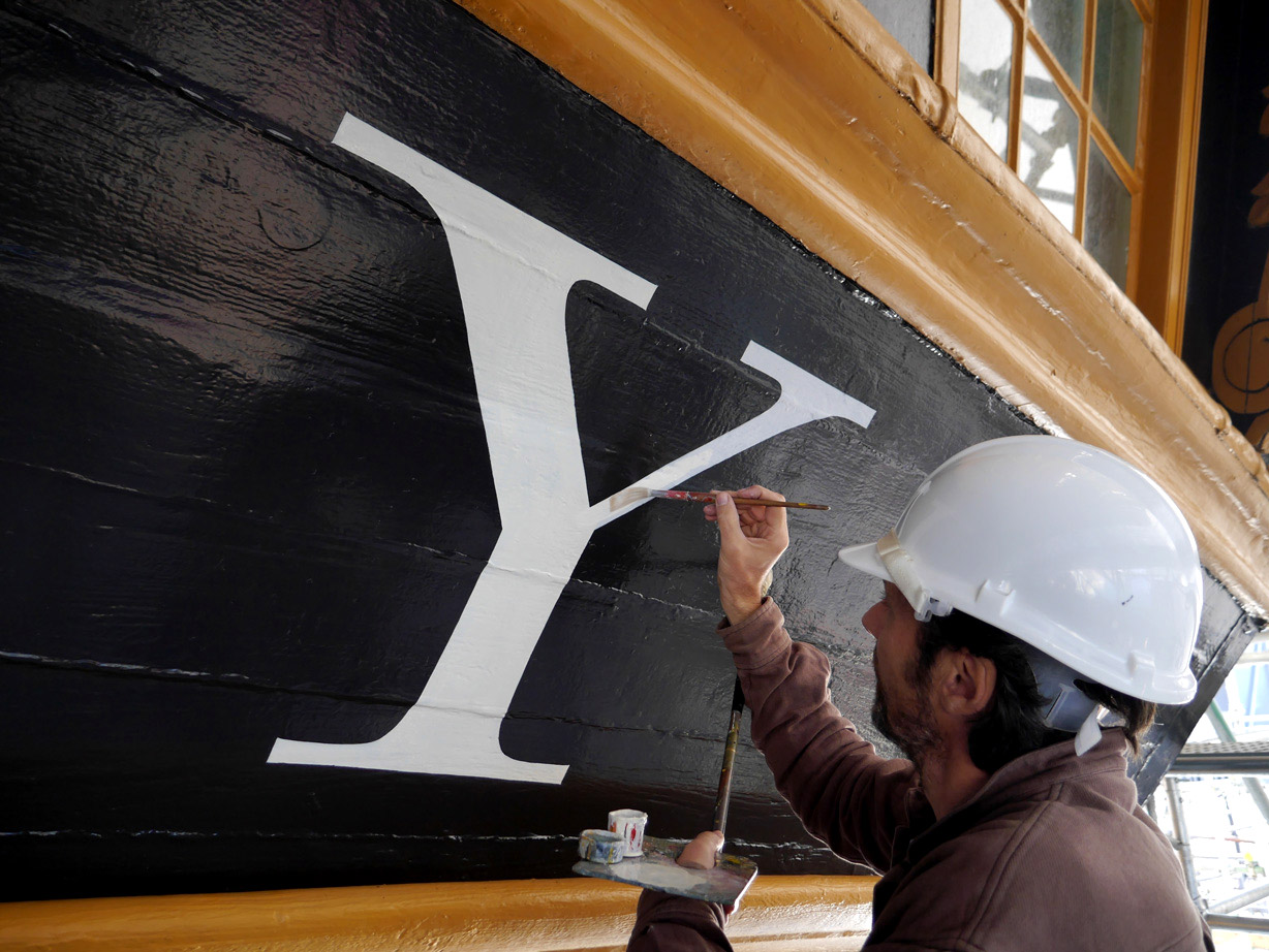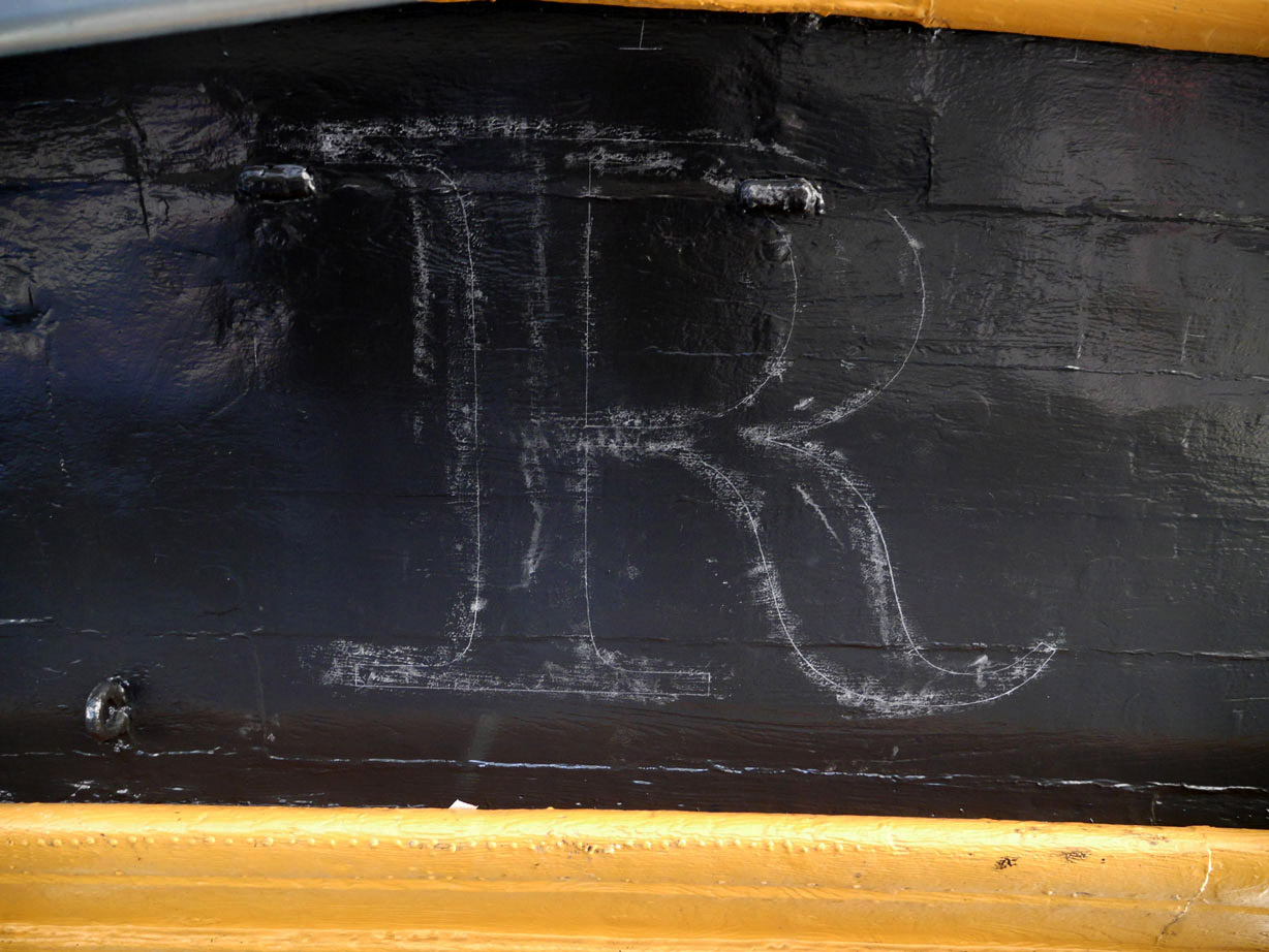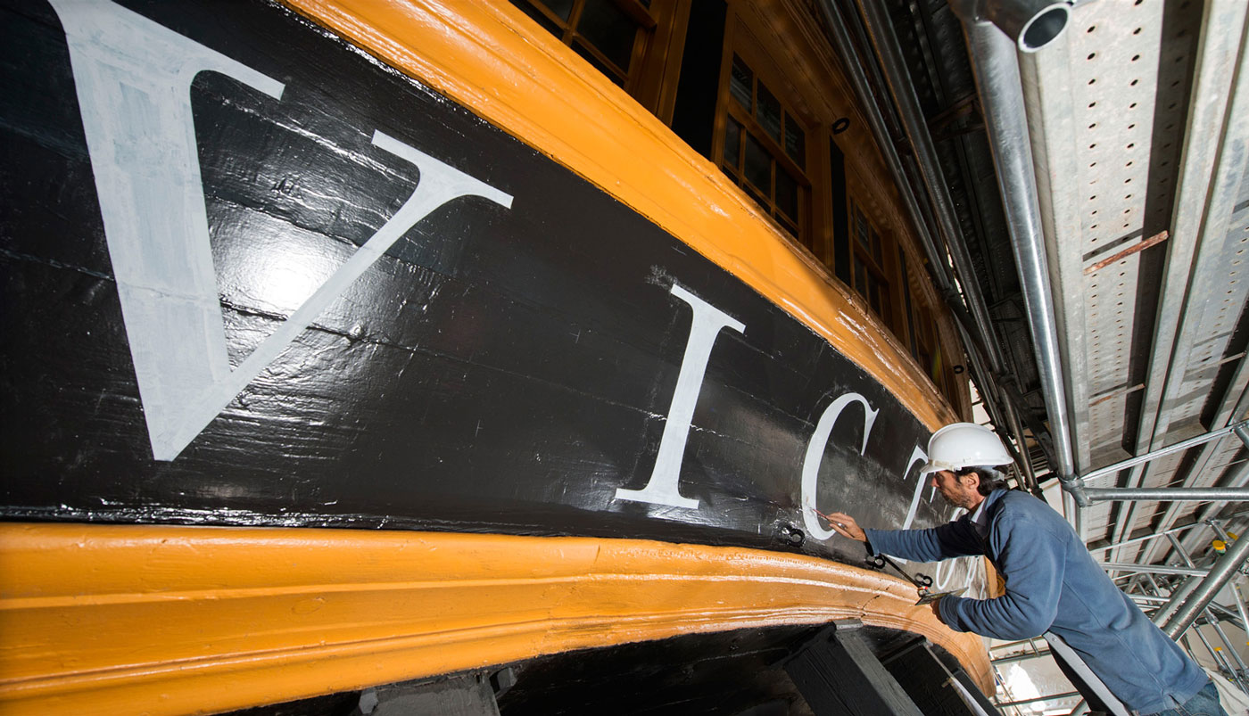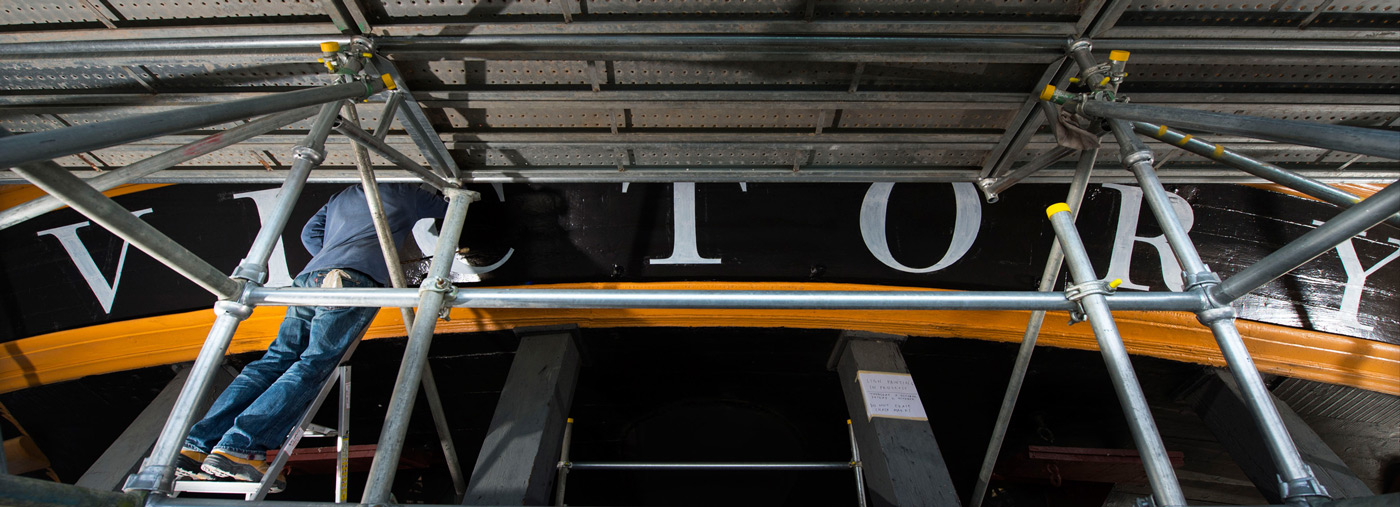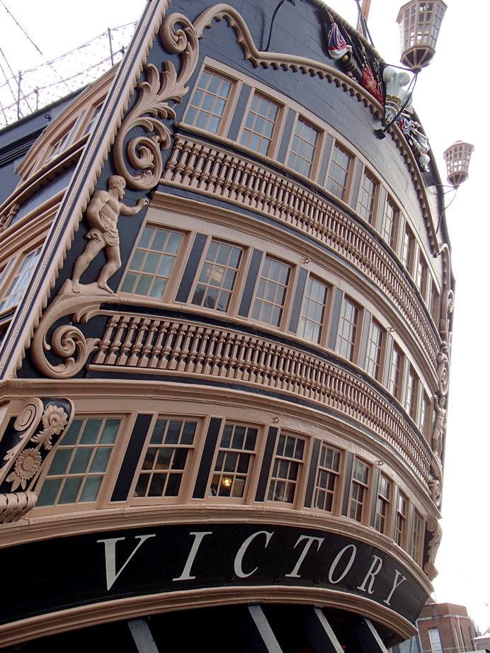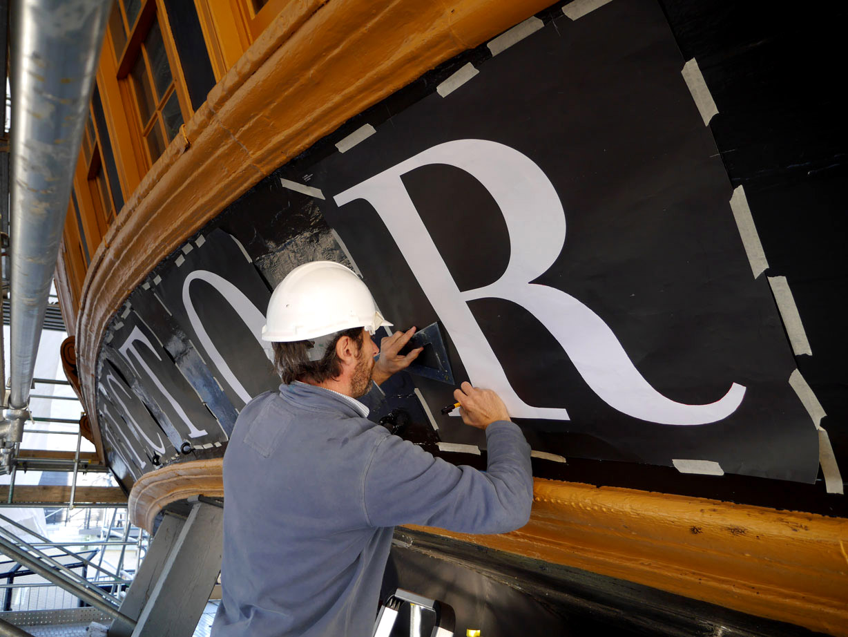 The name of HMS Victory, the oldest ship of the Royal Navy still in commission, launched in 1765, has been repainted. When Victory was repainted, many times over, during the 19th and 20th centuries, the name was naturally also redone, so the original letters were replaced. In 2005, when the ship was refurbished for the two-hundredth anniversary of the Battle of Trafalgar, the name was painted in a roman letter that was based on the inscription on the Column of Trajan in Rome, a style which was used during the 20th century for lettering on many historical monuments. Unfortunately this was a style that was quite unknown in Britain in 1805. During the current repainting of the ship, the style of the name has been painted in a bold and vigorous style that is based on the traditional lettering that is known to have been in use at that date. (James Mosley)