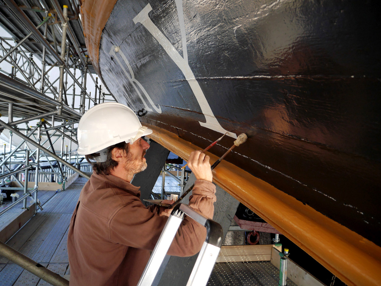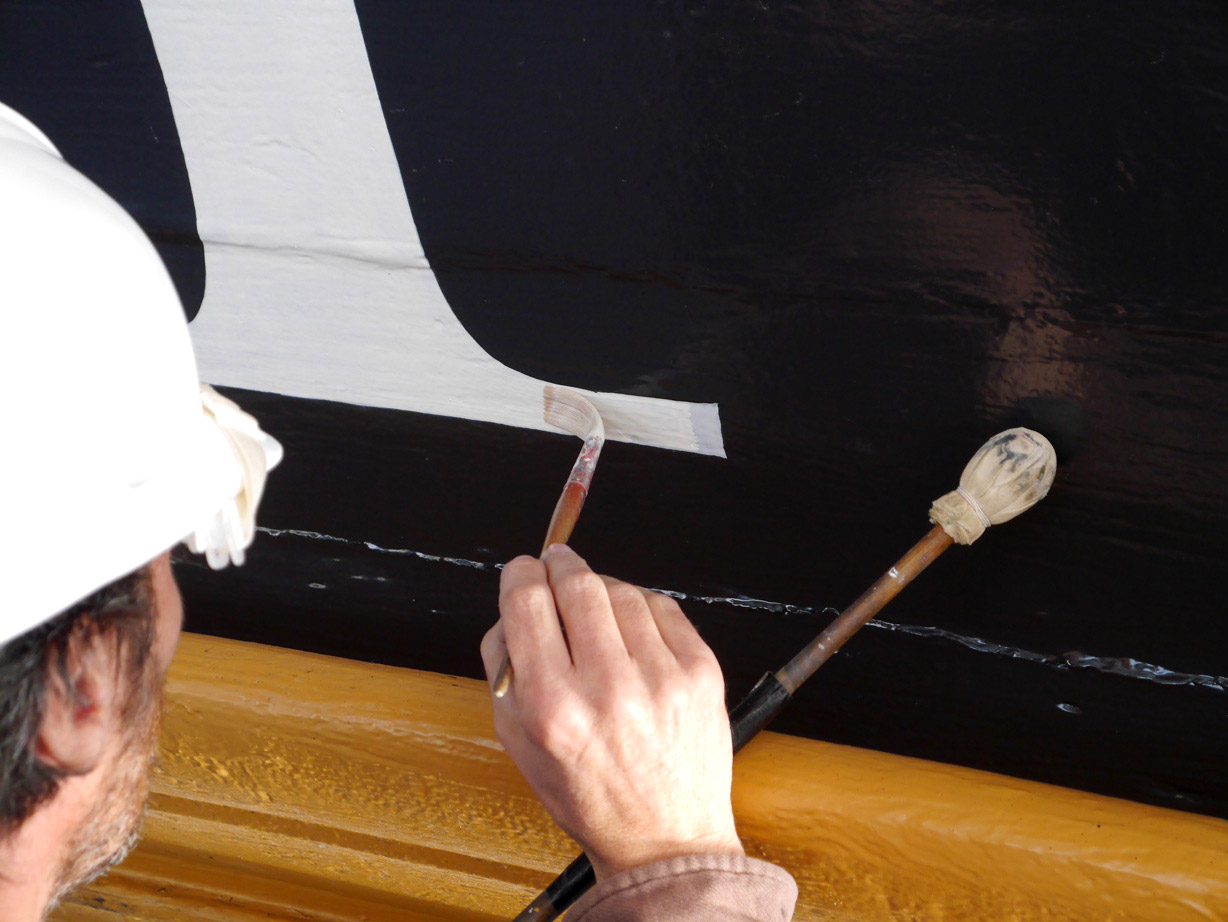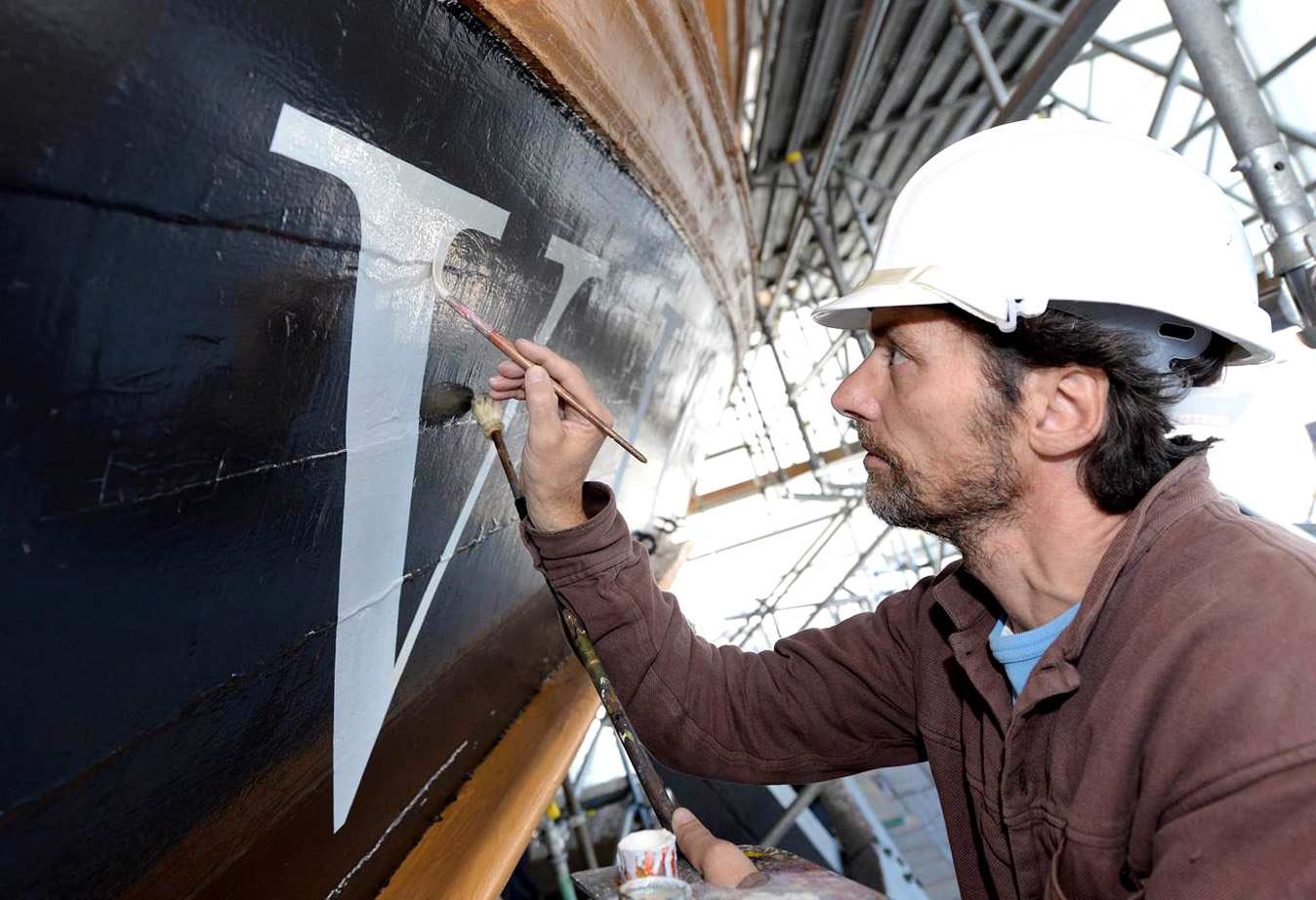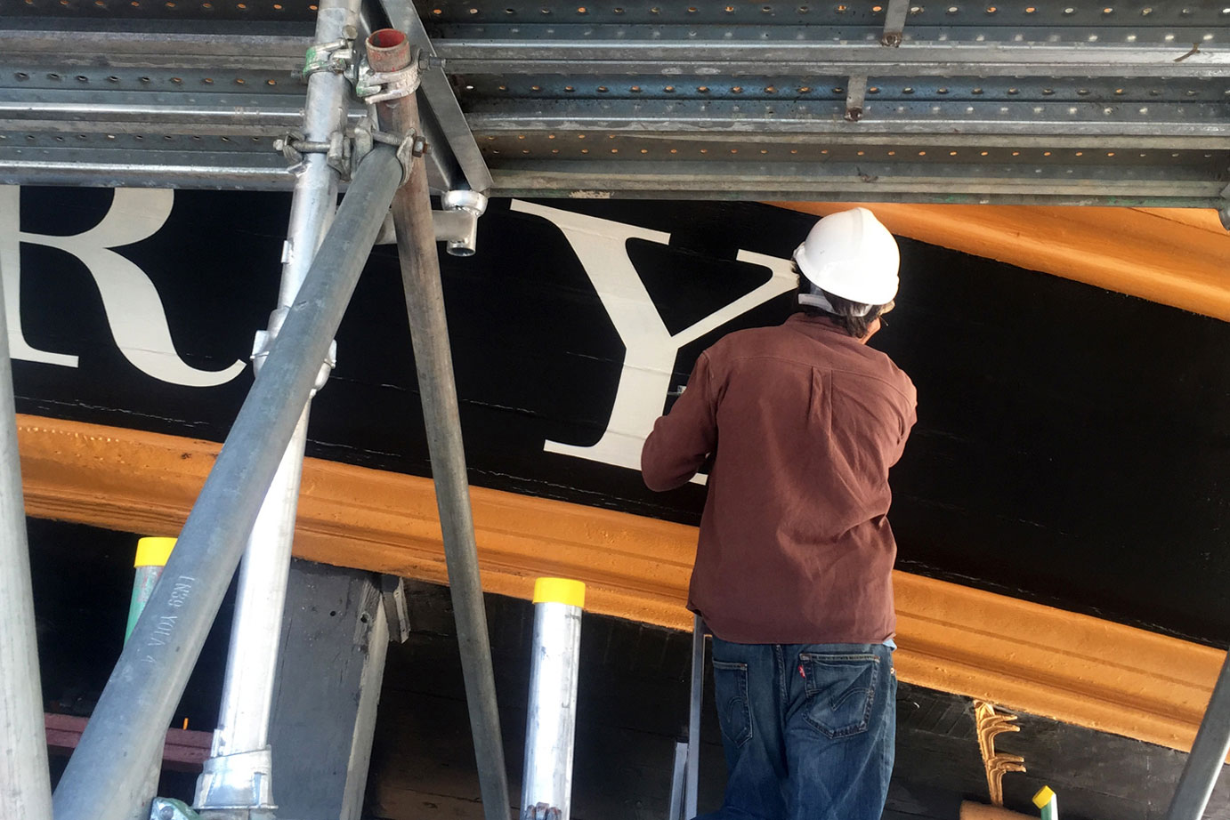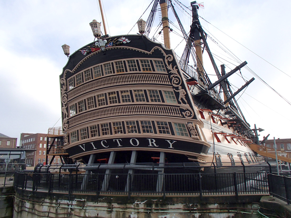 The name of HMS Victory, the oldest ship of the Royal Navy still in commission, launched in 1765, has been repainted. When Victory was repainted, many times over, during the 19th and 20th centuries, the name was naturally also redone, so the original letters were replaced. In 2005, when the ship was refurbished for the two-hundredth anniversary of the Battle of Trafalgar, the name was painted in a roman letter that was based on the inscription on the Column of Trajan in Rome, a style which was used during the 20th century for lettering on many historical monuments. Unfortunately this was a style that was quite unknown in Britain in 1805. During the current repainting of the ship, the style of the name has been painted in a bold and vigorous style that is based on the traditional lettering that is known to have been in use at that date. (James Mosley)